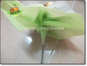 9. นำกระดาษสากลีบดอกไม้ที่เราทำไว้ในข้อ 6 – 8 มาจับช่อกับช่อเฟอเรโร่ช็อกโกแลตให้สวยงาม จากนั้นพันด้วยสก็อตเทปใสให้แน่น ตามรูปด้านล่าง