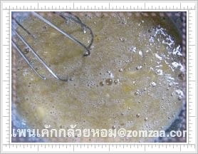 4. นำกล้วยหอมบด ไข่ไก่ เกลือ น้ำตาล คนให้เข้ากันด้วยตะกร้อมือ (พอน้ำตาลละลาย)