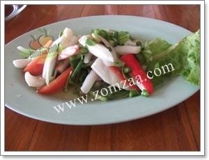 - จากนั้นเติมหอมใหญ่ ขึ้นฉ่าย ต้นหอม มะเขือเทศ และปูอัด และ ปลาหมึกลวก ลงไปคลุกให้เข้ากันอีกครั้ง
