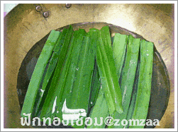 3. เตรียมกระทะทอง จากนั้นใส่น้ำสะอาดลงไป นำใบเตย 6 – 8 ใบ ล้างให้สะอาด ขยี้ ๆ หน่อย แล้วใส่ลงไปคะ
