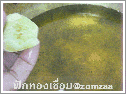5. จากนั้นคนน้ำตาลให้ละลายให้หมด (ถ้าไม่คนน้ำตาลจะนอนก้นกระทะ) น้ำตาลละลายหมดแล้วเพิ่มเป็นไฟกลาง ใส่ฟักทองลงไปคะ