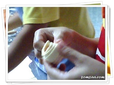 5. นำมาแป้งมาคลึง (ตามรูป) ตอนคลึงอย่าลืมเอาแป้งนวล(แป้งเค้ก) โรยบนโต๊ะและไม้คลึงด้วยเพื่อไม่แป้งติด และให้คลึงแป้งประมาณ 2 ทบ