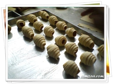 7. ไส้กรอก 1 แท่งนำมาตัดเป็น 3 ส่วน แล้วห่อในแป้งสามเหลี่ยม หรือจะทำเป็นครัวซองต์เนยสดก็ได้ วิธีการห่อก็ให้วางไส้กรอกด้านกว้าง แล้วให้ม้วนเรื่อย ๆ จนหมดแป้ง