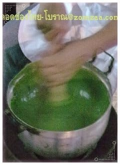 1. เอาแป้งข้าวเจ้ามาใส่ภาชนะ เช่น กาละมังเล็ก ๆ ใส่น้ำใบเตยคั้นลงไป ใส่น้ำปูนใสลงไปด้วย (ค่อย ๆ ใส่นะจ๊ะ โดยใส่สลับกันระหว่างน้ำใบเตยกันน้ำปูนใส) แล้วจึงค่อย ๆ นวดให้เข้ากันจนละลายกับแป้งให้เข้าหมด ต้องใจเย็น ๆ คะ ไม่งั้นแป้งจะเป็นก้อนไม่เข้ากัน