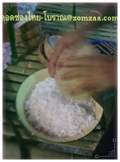 6. หากแป้งที่เทไว้หนืดเกินและไม่สามารถไหลลงมาได้แล้ว เค้าจะเอาท่อนไม้แบบในภาพมากดอีกครั้งคะเพื่อให้แป้งไหลลง (แต่ส้มไม่ทราบว่าเรียกว่าอะไร ต้องขอโทษด้วยคะ ^^’) ในภาพเปลี่ยนจากกะลาเป็นหม้อแล้ว …