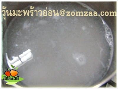 7. น้ำมะพร้าวที่เราตั้งไฟไว้พอเดือด ให้ตักใบเตยออกก่อนคะ น้ำมะพร้าวจะหอมมาก อิอิ ^^’